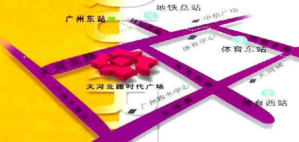 时代广场坐落于广州新城市中心被誉为“广州华尔街”的天河北路。广场占地面积为18183m2,总建筑面积达111,300 m2,一至六楼为大型购物中心(约66600 m2),8至11楼为高级智能化写字楼(约34000 m2),负一层为可容纳340个车位的停车场。